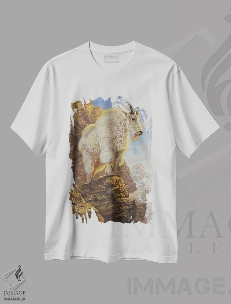تیشرت سفید طرح دار قوچ کوهستان راکی، دکور کلبه و لژ اثر ازرا تاکر | فروشگاه ایماژ تیشرت طرح دار قوچ کوهستان راکی اثر ازرا تاکر