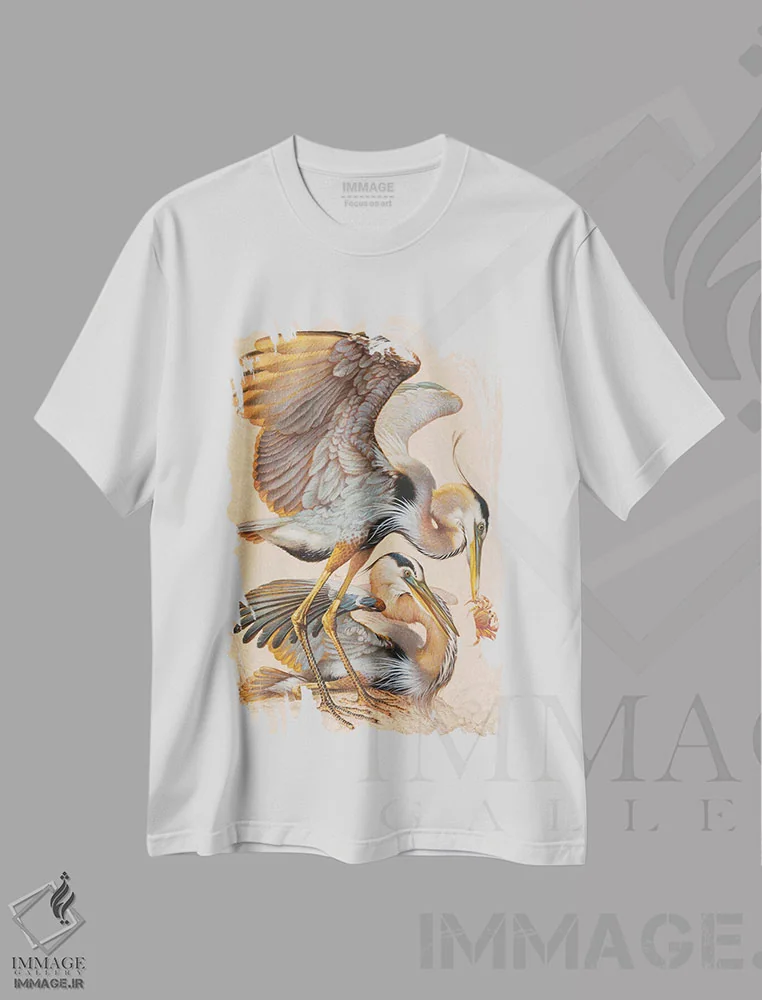 تیشرت سفید طرح دار حواصیل های آبی بزرگ، دکور ساحلی اثر ازرا تاکر | فروشگاه ایماژ تیشرت طرح دار حواصیل های آبی بزرگ اثر ازرا تاکر
