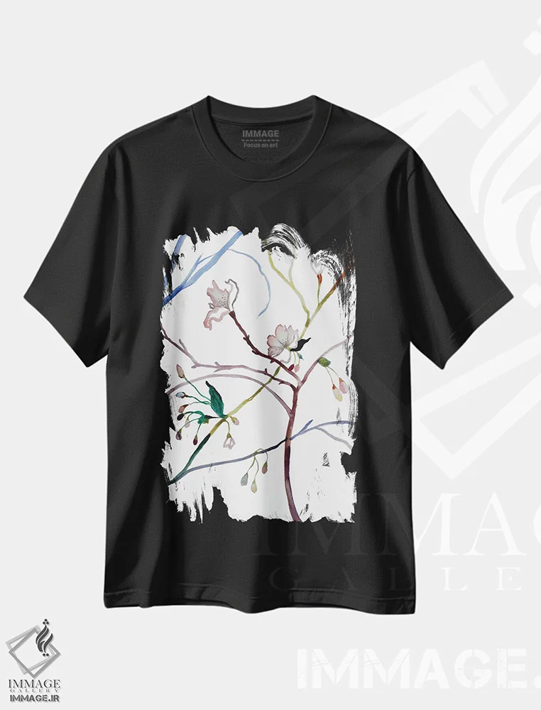 تیشرت مشکی طرح دار شکوفهٔ گیلاس شمارهٔ ۳۵، هنر فاخر معاصر اثر الیزابت بکر | فروشگاه ایماژ تیشرت طرح دار شکوفهٔ گیلاس شمارهٔ اثر الیزابت بکر