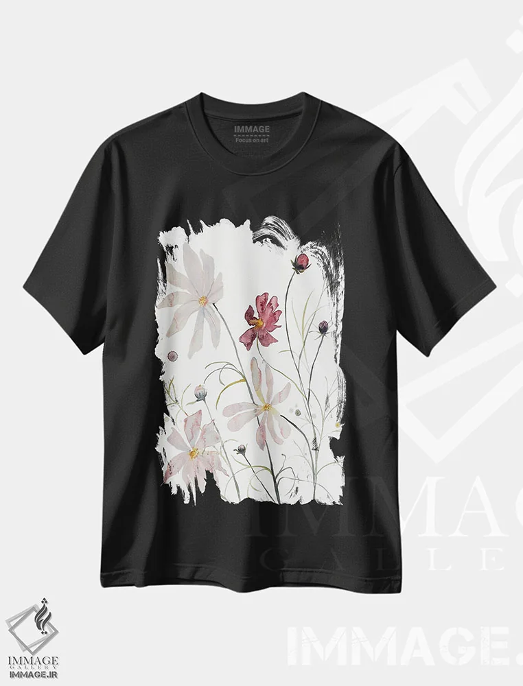 تیشرت مشکی طرح دار رز وحشی شمارهٔ ۱۵، هنر فاخر معاصر اثر الیزابت بکر | فروشگاه ایماژ تیشرت طرح دار رز وحشی شمارهٔ اثر الیزابت بکر