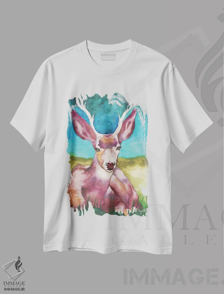 تیشرت سفید طرح دار گوزن نر در مزرعه ۱، مدیوم اثر الیزابت مدلی | فروشگاه ایماژ تیشرت طرح دار گوزن نر در مزرعه اثر الیزابت مدلی