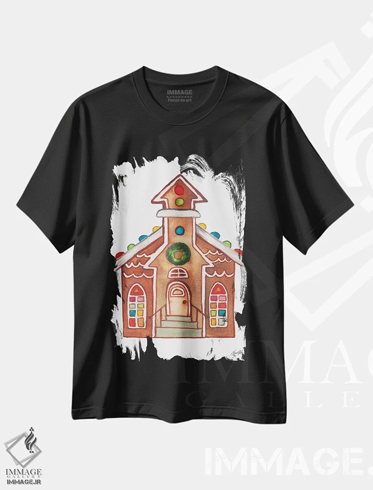 تیشرت مشکی طرح دار خانهٔ آب نبات و نان زنجبیلی ۲، دکور تعطیلات اثر الیزابت مدلی | فروشگاه ایماژ تیشرت طرح دار خانهٔ آب نبات و نان زنجبیلی اثر الیزابت مدلی