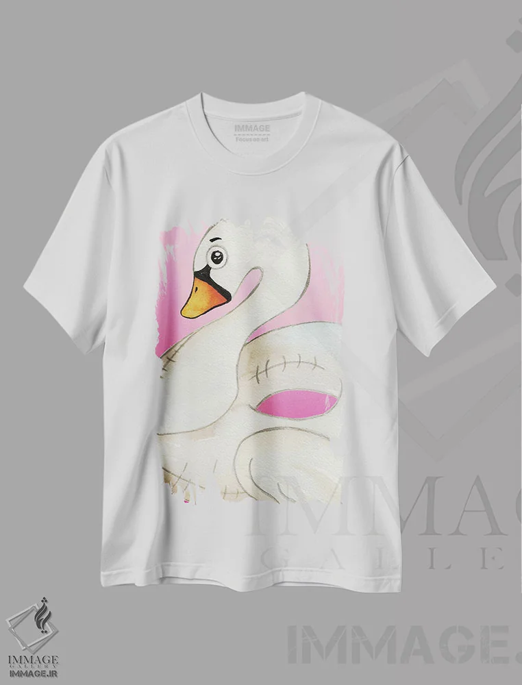 تیشرت سفید طرح دار قو شناور روی پس زمینهٔ صورتی، مدیوم اثر الیزابت مدلی | فروشگاه ایماژ تیشرت طرح دار قو شناور روی پس زمینهٔ صورتی اثر الیزابت مدلی
