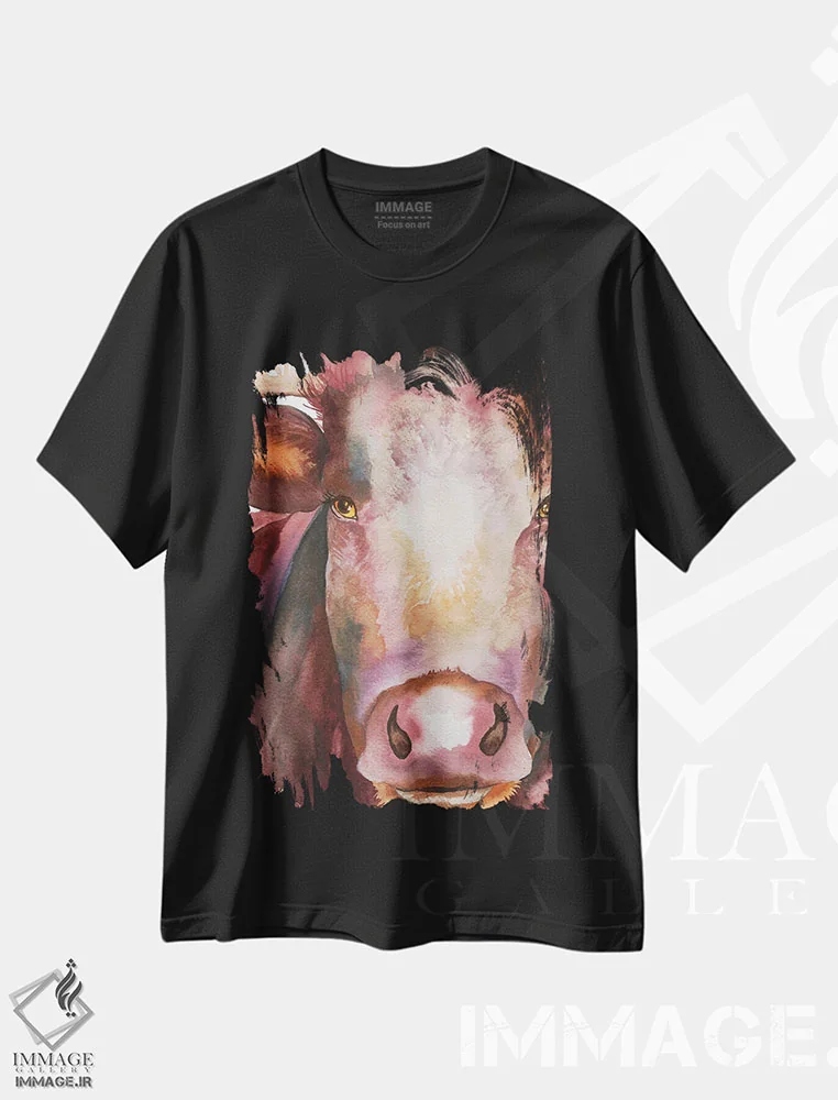 تیشرت مشکی طرح دار پرترهٔ گاو، دکور روستایی اثر الیزابت مدلی | فروشگاه ایماژ تیشرت طرح دار پرترهٔ گاو اثر الیزابت مدلی