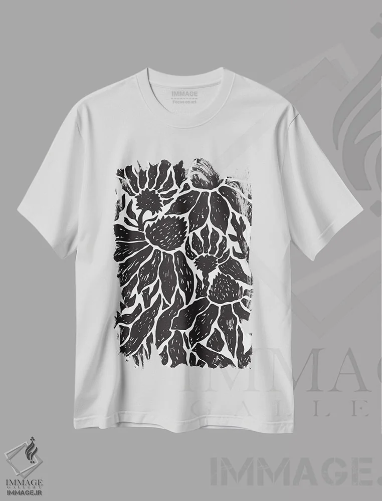 تیشرت سفید طرح دار چاپ لینوکات گل سیاه و سفید، آبستره اثر الیزابت مدلی | فروشگاه ایماژ تیشرت طرح دار چاپ لینوکات گل سیاه و سفید اثر الیزابت مدلی