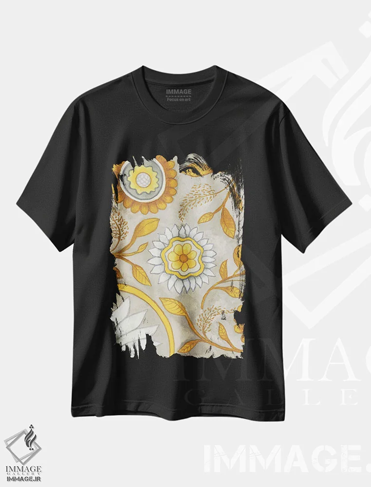 تیشرت مشکی طرح دار گل های صدتومانی زرد، تزئینی اثر الیزابت مدلی | فروشگاه ایماژ تیشرت طرح دار گل های صدتومانی زرد اثر الیزابت مدلی