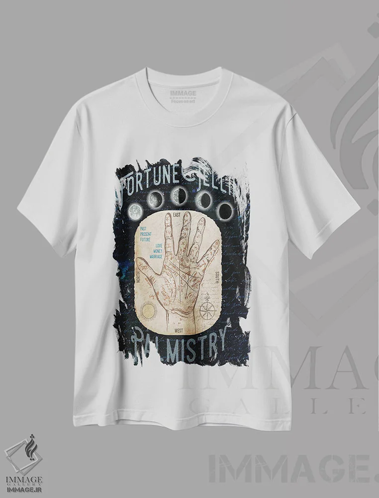 تیشرت سفید طرح دار فال خوانی ۱، تزئینی اثر الیزابت مدلی | فروشگاه ایماژ تیشرت طرح دار فال خوانی اثر الیزابت مدلی