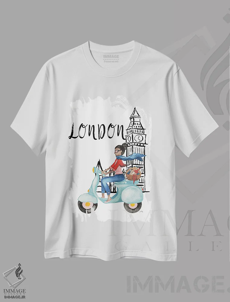 تیشرت سفید طرح دار لندن با موتور گازی، تزئینی اثر الیزابت مدلی | فروشگاه ایماژ تیشرت طرح دار لندن با موتور گازی اثر الیزابت مدلی