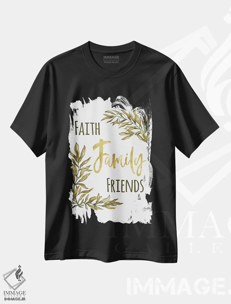 تیشرت مشکی طرح دار ایمان، خانواده، دوستان، مدیوم اثر الیزابت مدلی | فروشگاه ایماژ تیشرت طرح دار ایمان، خانواده، دوستان اثر الیزابت مدلی