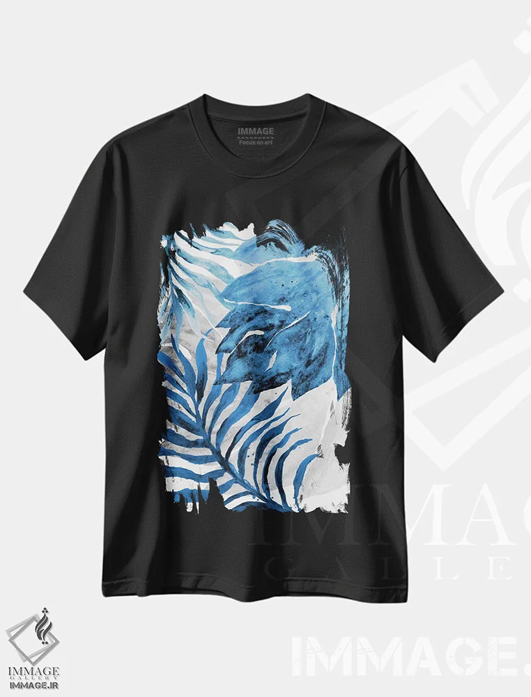 تیشرت مشکی طرح دار سرخس و برگ آبی شمارهٔ دو، تزئینی اثر الیزابت مدلی | فروشگاه ایماژ تیشرت طرح دار سرخس و برگ آبی شمارهٔ دو اثر الیزابت مدلی