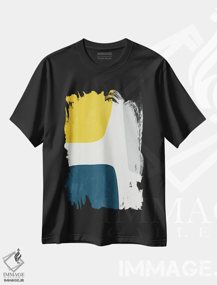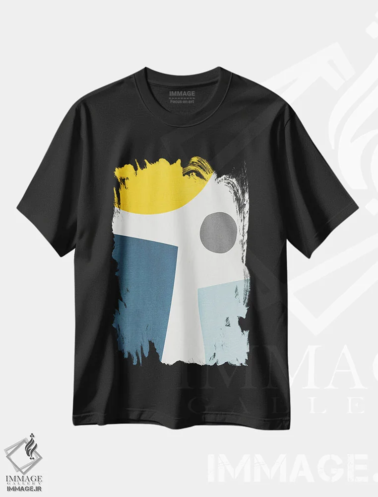 تیشرت مشکی طرح دار ترکیب انتزاعی مدرن با خردلی و فیروزه ای و خاکستری ۲ اثر ام سی دیزاین لب | فروشگاه ایماژ تیشرت طرح دار ترکیب انتزاعی مدرن با خردلی و فیروزه ای و خاکستری اثر ام سی دیزاین لب