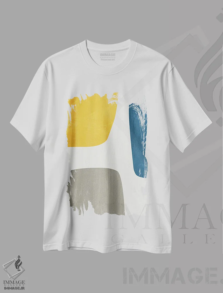 تیشرت سفید طرح دار انتزاعی زرد و آبی III اثر ام سی دیزاین لب | فروشگاه ایماژ تیشرت طرح دار انتزاعی زرد و آبی III اثر ام سی دیزاین لب
