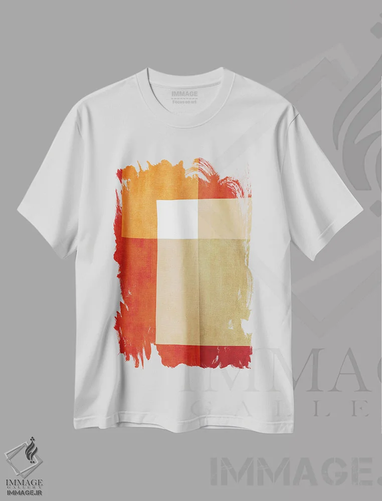 تیشرت سفید طرح دار انتزاعی قرمز سفید نارنجی بژ اثر ام سی دیزاین لب | فروشگاه ایماژ تیشرت طرح دار انتزاعی قرمز سفید نارنجی بژ اثر ام سی دیزاین لب