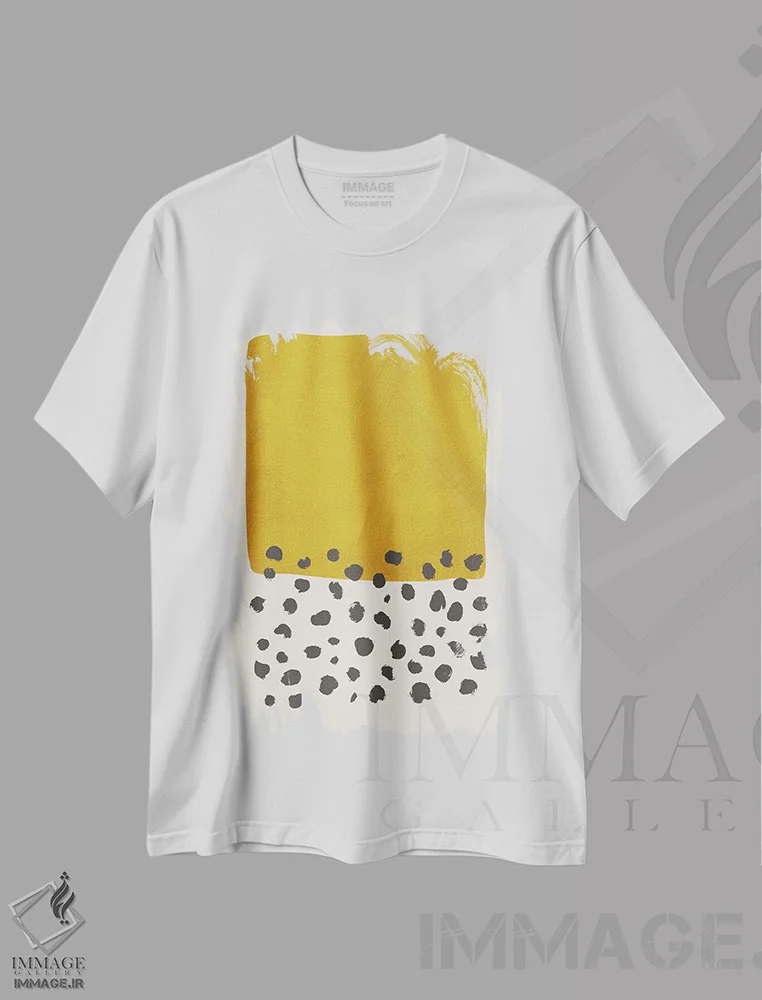 تیشرت سفید طرح دار نقطه های سیاه خردلی I اثر ام سی دیزاین لب | فروشگاه ایماژ تیشرت طرح دار نقطه های سیاه خردلی I اثر ام سی دیزاین لب