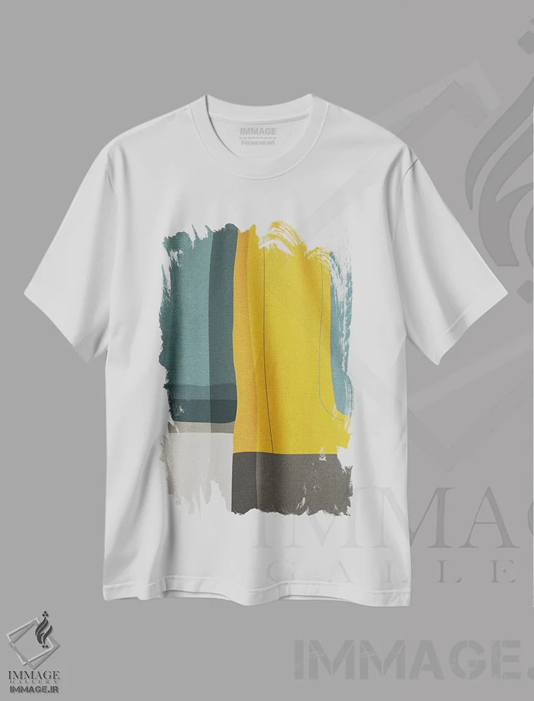 تیشرت سفید طرح دار ترکیب انتزاعی مدرن با خردلی و فیروزه ای و خاکستری ۱ اثر ام سی دیزاین لب | فروشگاه ایماژ تیشرت طرح دار ترکیب انتزاعی مدرن با خردلی و فیروزه ای و خاکستری اثر ام سی دیزاین لب