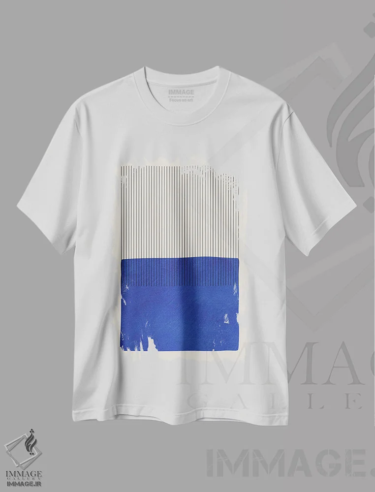تیشرت سفید طرح دار خطوط عمودی آبی ماتیس اثر ام سی دیزاین لب | فروشگاه ایماژ تیشرت طرح دار خطوط عمودی آبی ماتیس اثر ام سی دیزاین لب