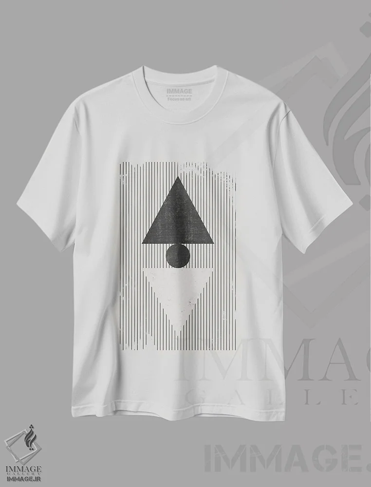 تیشرت سفید طرح دار مثلث های سیاه و سفید و خطوط عمودی اثر ام سی دیزاین لب | فروشگاه ایماژ