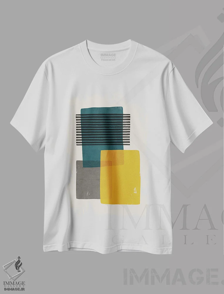 تیشرت سفید طرح دار مدرن خردلی فیروزه ای خاکستری ۱ اثر ام سی دیزاین لب | فروشگاه ایماژ