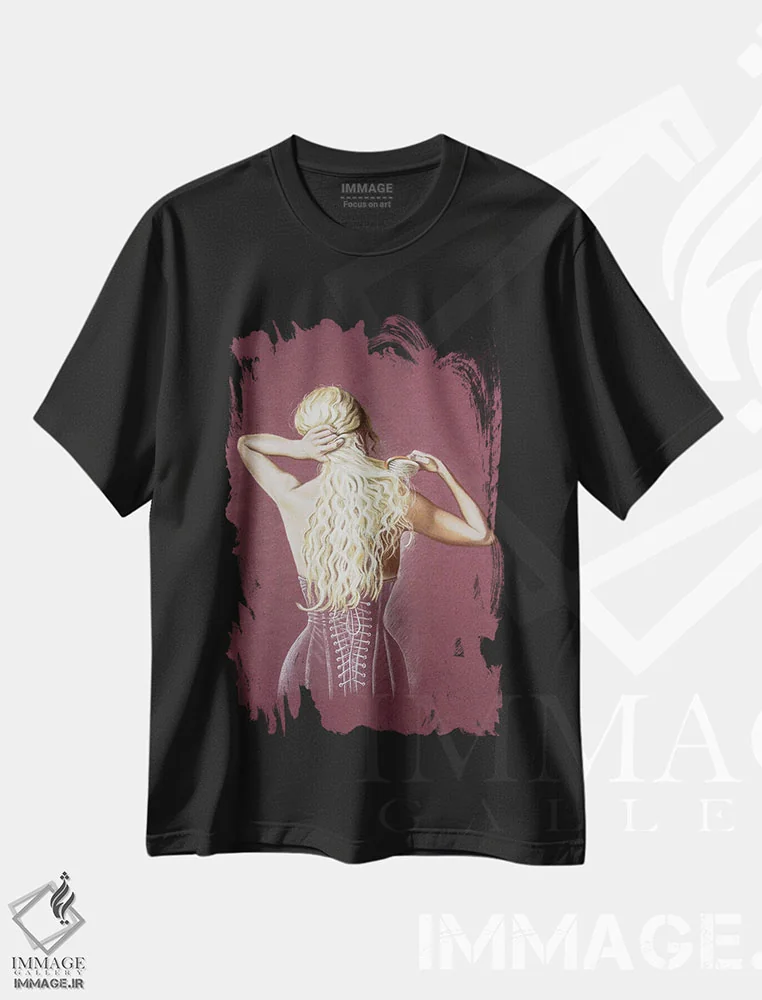 تیشرت مشکی طرح دار دختری با کرست، هنر فاخر معاصر اثر اینا مدودوا | فروشگاه ایماژ تیشرت طرح دار دختری با کرست اثر اینا مدودوا