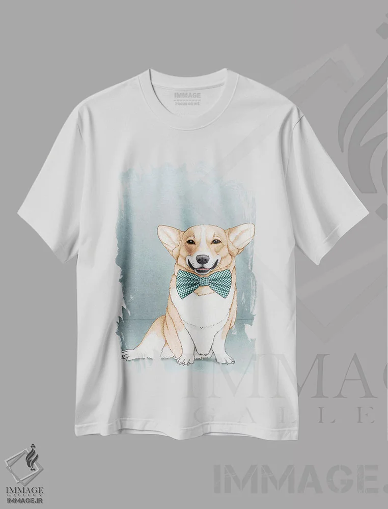 تیشرت سفید طرح دار سگ کورگی، هنر فاخر اثر باروف | فروشگاه ایماژ تیشرت طرح دار سگ کورگی اثر باروف