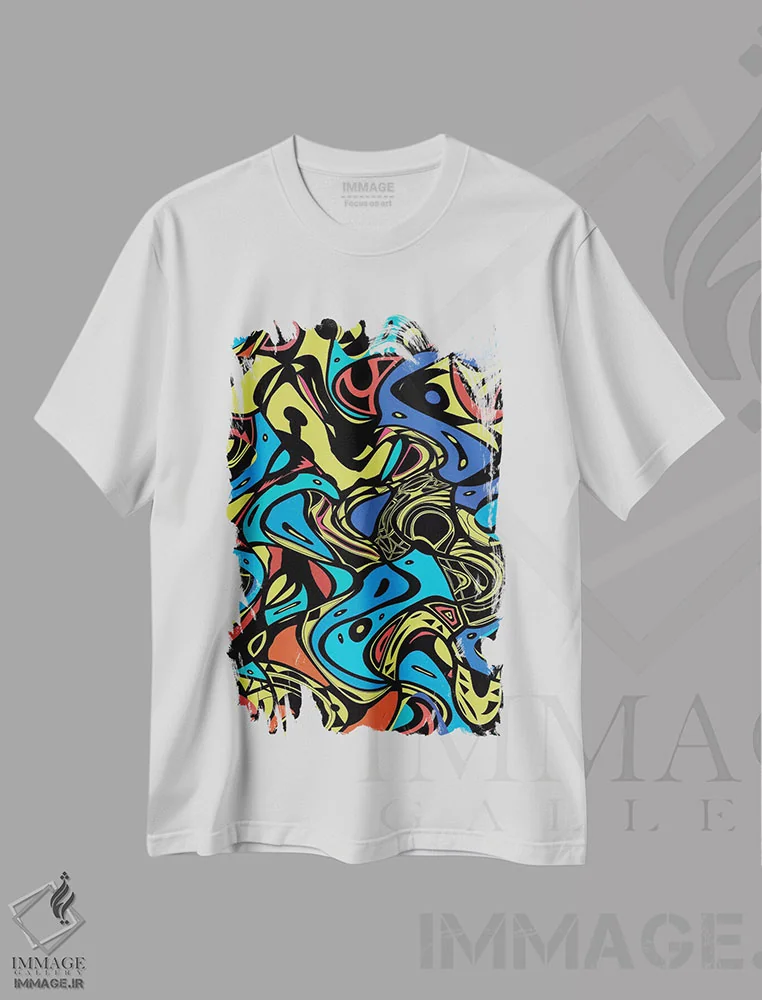 تیشرت سفید طرح دار بی نظمی رنگارنگ شهری اثر باروف | فروشگاه ایماژ تیشرت طرح دار بی نظمی رنگارنگ شهری اثر باروف