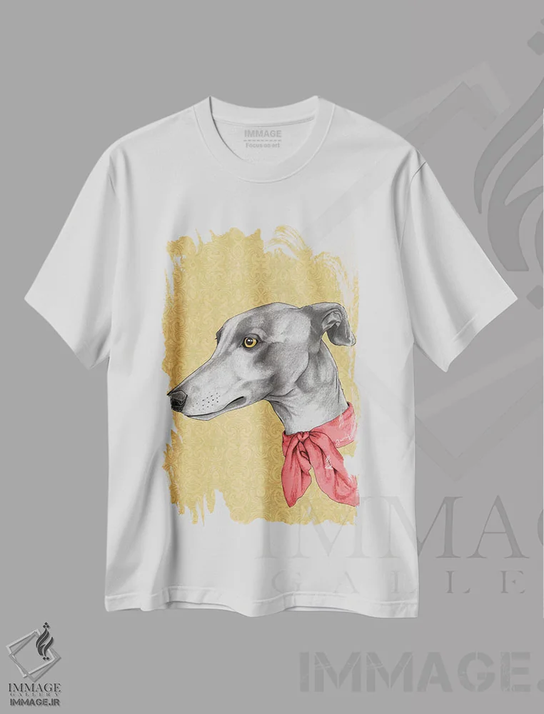 تیشرت سفید طرح دار تازی با شال گردن، دکور معاصر اثر باروف | فروشگاه ایماژ تیشرت طرح دار تازی با شال گردن اثر باروف