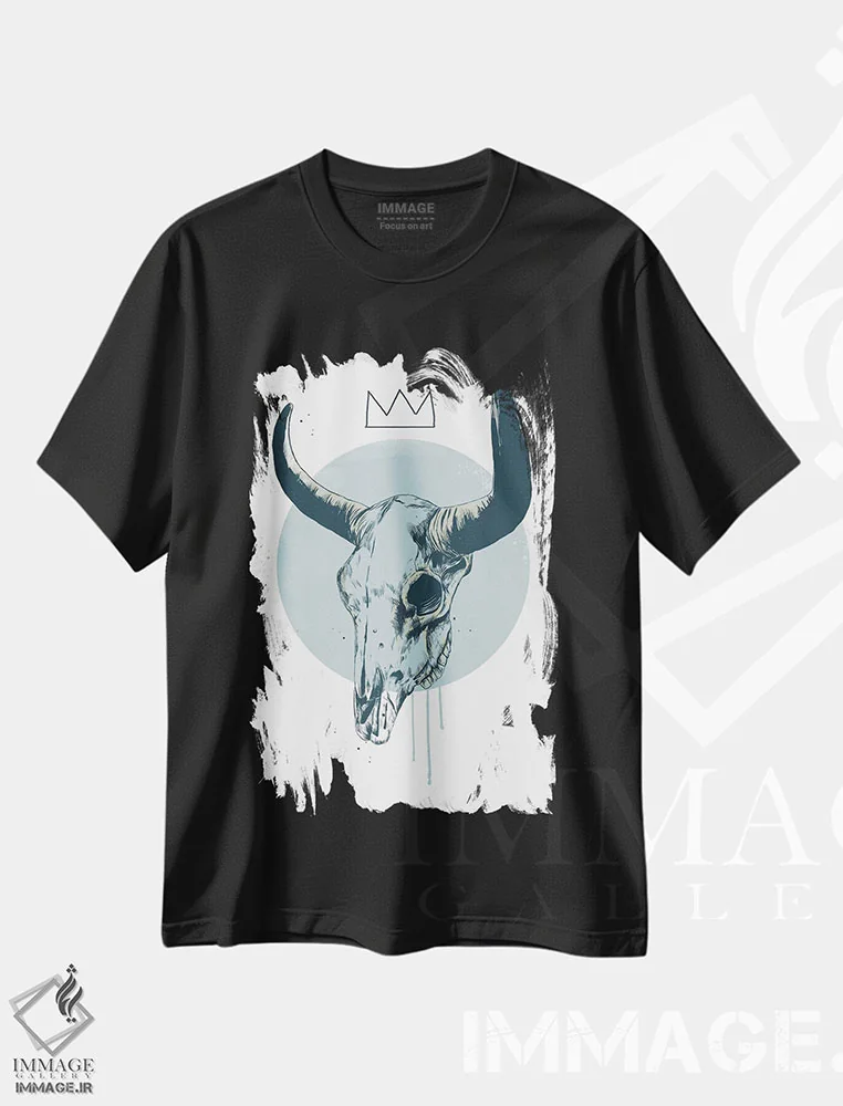 تیشرت مشکی طرح دار جمجمه گاو، تزئینی اثر بالازس شولتی | فروشگاه ایماژ