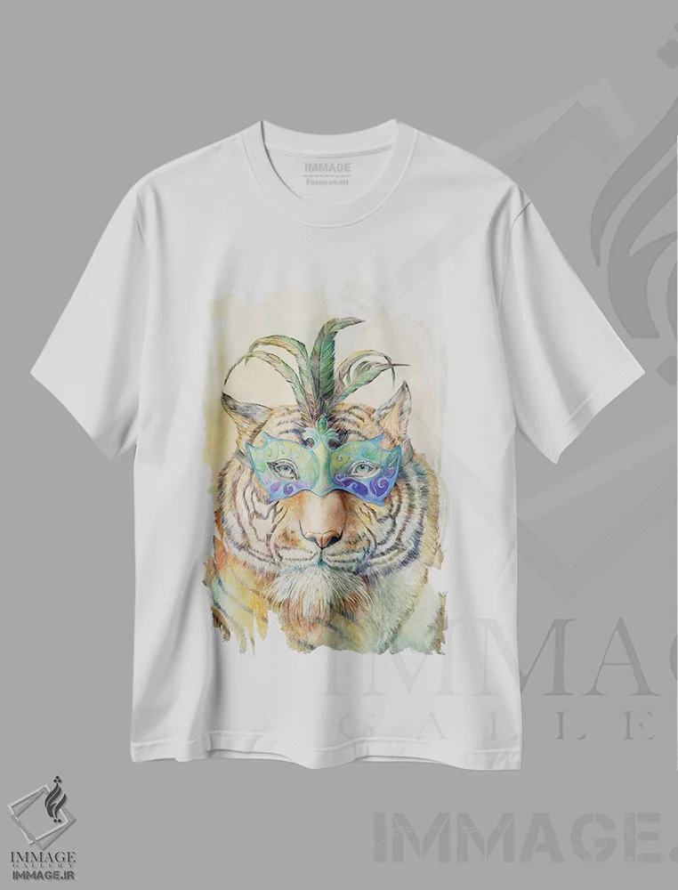 تیشرت سفید طرح دار ببر نقاب دار، هنر فاخر اثر براندون کیهنر | فروشگاه ایماژ تیشرت طرح دار ببر نقاب دار اثر براندون کیهنر