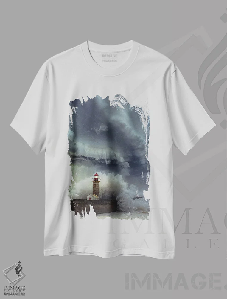 تیشرت سفید طرح دار باران سیل آسا در فانوس دریایی، مدیوم اثر برنت شاونور | فروشگاه ایماژ