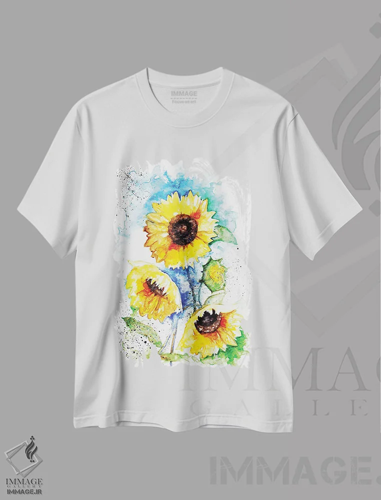 تیشرت سفید طرح دار گل های آفتابگردان، مدیوم اثر بیبزآرتس | فروشگاه ایماژ تیشرت طرح دار گل های آفتابگردان اثر بیبزآرتس