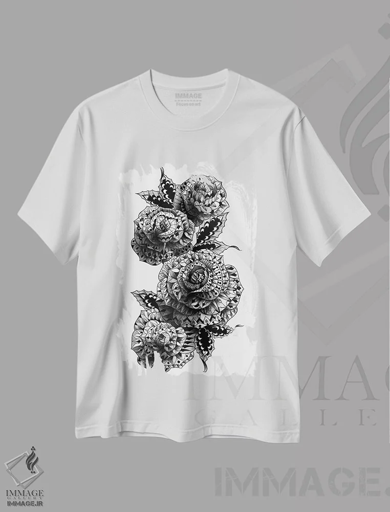 تیشرت سفید طرح دار چهار گل رز، نقاشی و تصویرگری سیاه و سفید اثر بیوورکز | فروشگاه ایماژ