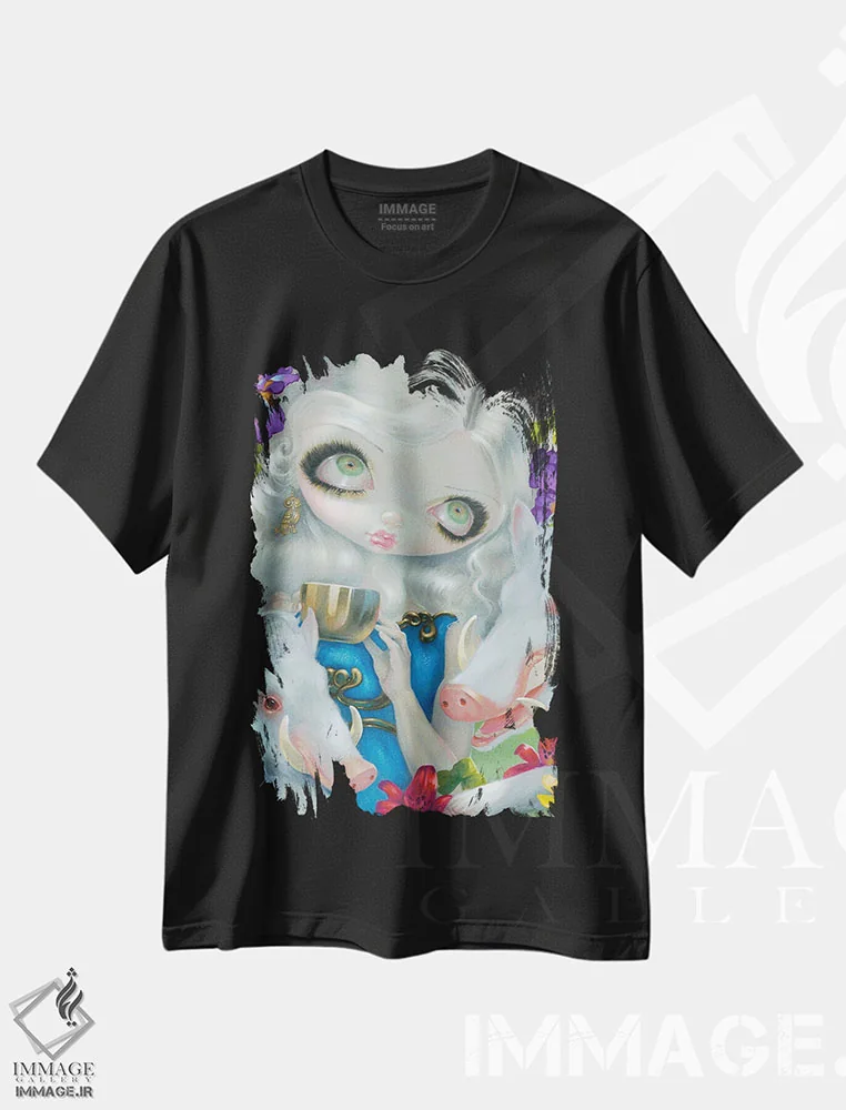 تیشرت مشکی طرح دار سیرسه و خوک ها، دکوراسیون جایگزین اثر جزمین بکِت-گریفیت | فروشگاه ایماژ تیشرت طرح دار سیرسه و خوک ها اثر جزمین بکِت-گریفیت