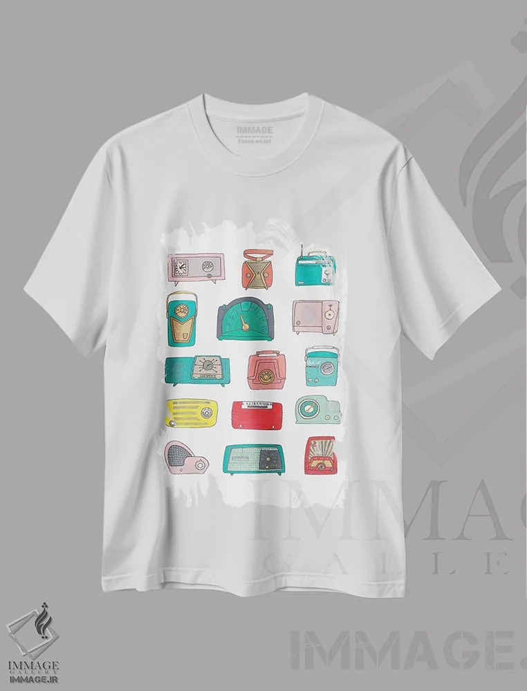 تیشرت سفید طرح دار رادیوهای رترو، تزئینی اثر جن بوچلی | فروشگاه ایماژ