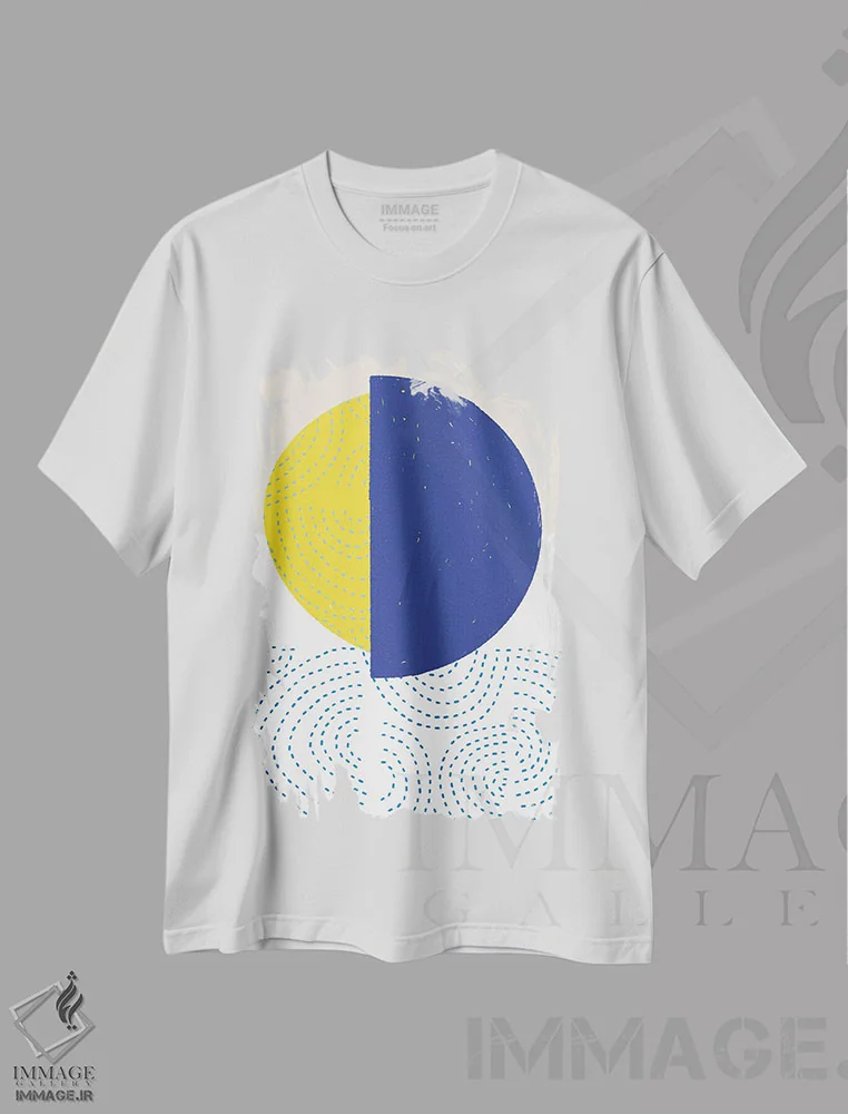تیشرت سفید طرح دار دایره های مدرن آبی و زرد I، تزئینی اثر جن بوچلی | فروشگاه ایماژ