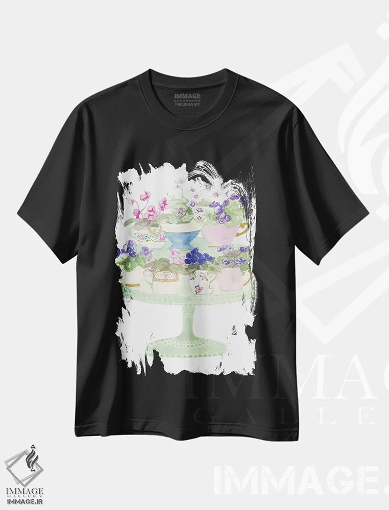 تیشرت مشکی طرح دار فنجان های چای گلدار، تزئینی اثر جن بوچلی | فروشگاه ایماژ