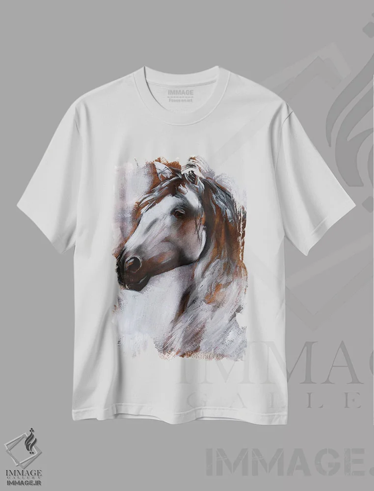 تیشرت سفید طرح دار اسب با مهار به صورت طراحی ۱، دکور معاصر اثر جنیفر پکستون پارکر | فروشگاه ایماژ