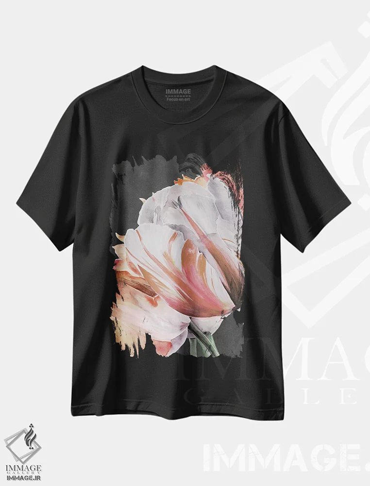 تیشرت مشکی طرح دار لاله های پاستلی به شکل طوطی ۳، تزئینی اثر جنیفر پکستون پارکر | فروشگاه ایماژ