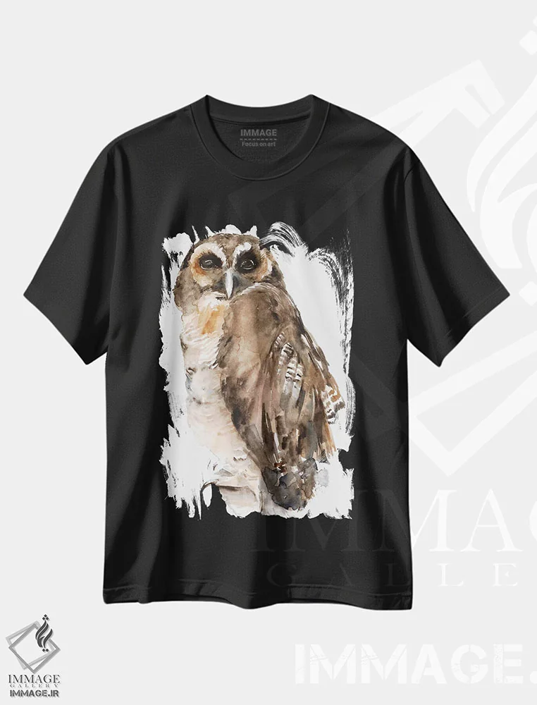 تیشرت مشکی طرح دار جغد با آبرنگ ۱، تزئینی اثر جنیفر پکستون پارکر | فروشگاه ایماژ