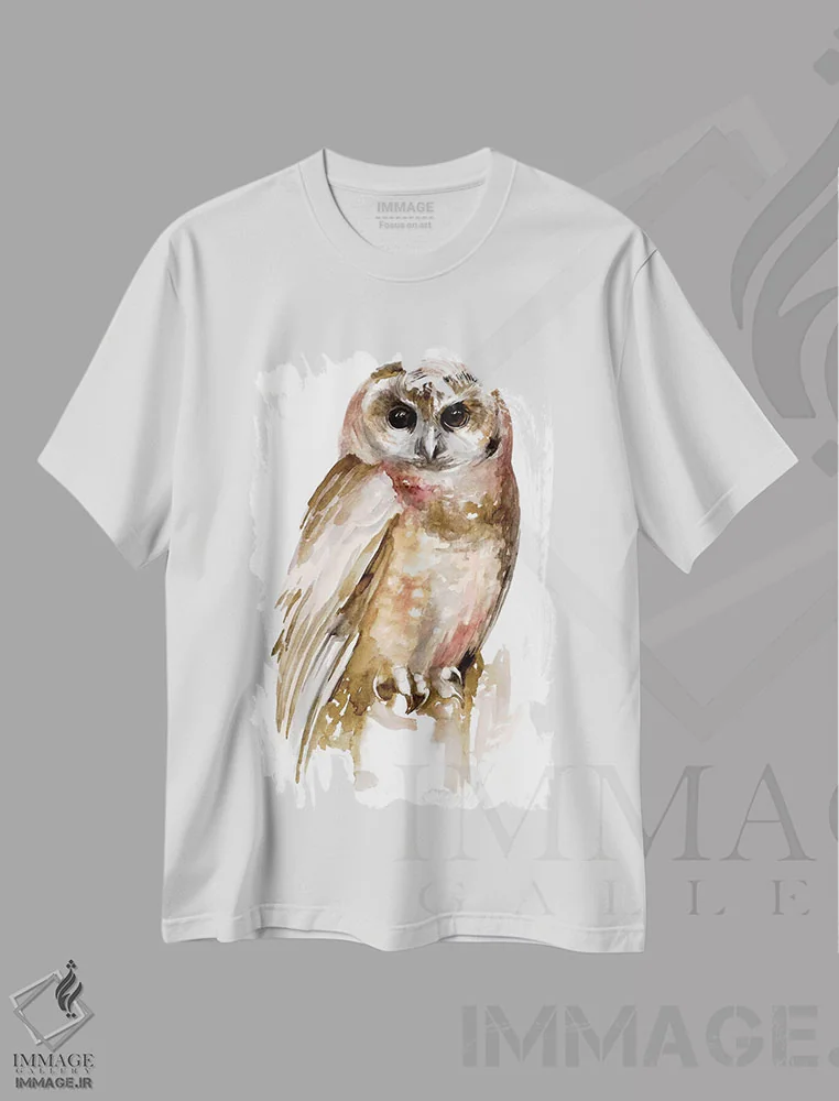 تیشرت سفید طرح دار جغد با آبرنگ ۲، تزئینی اثر جنیفر پکستون پارکر | فروشگاه ایماژ