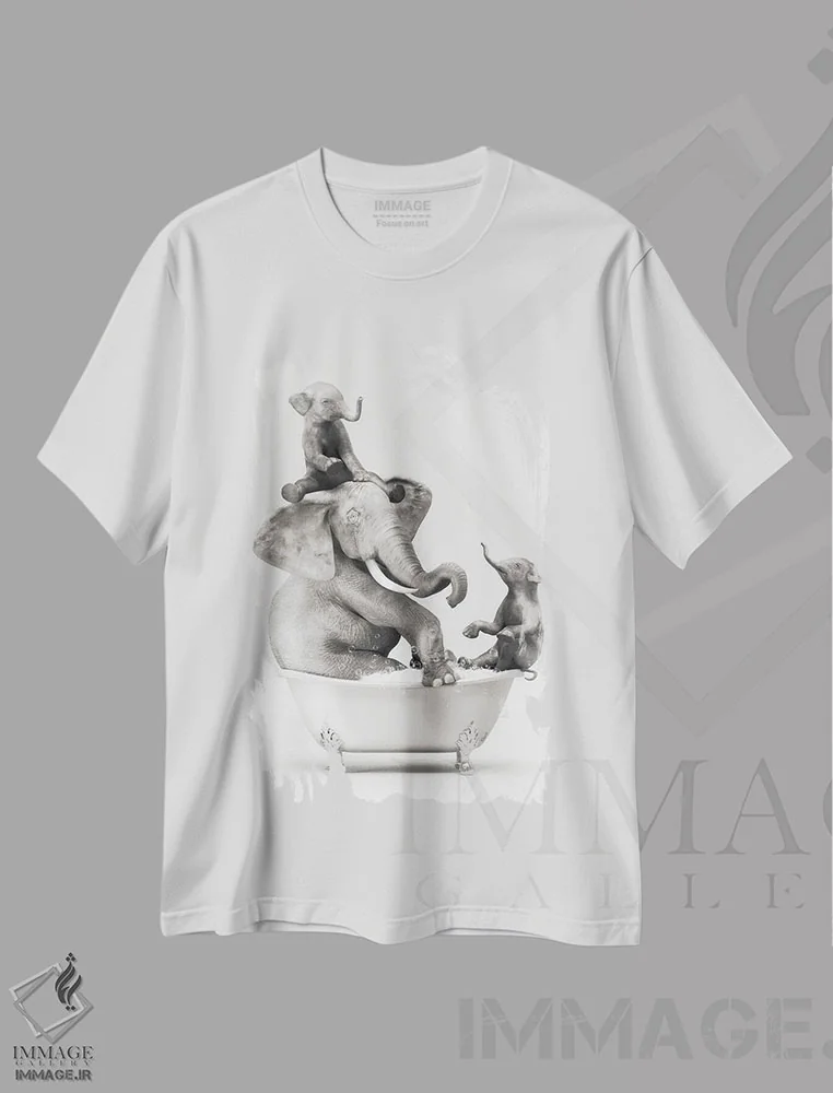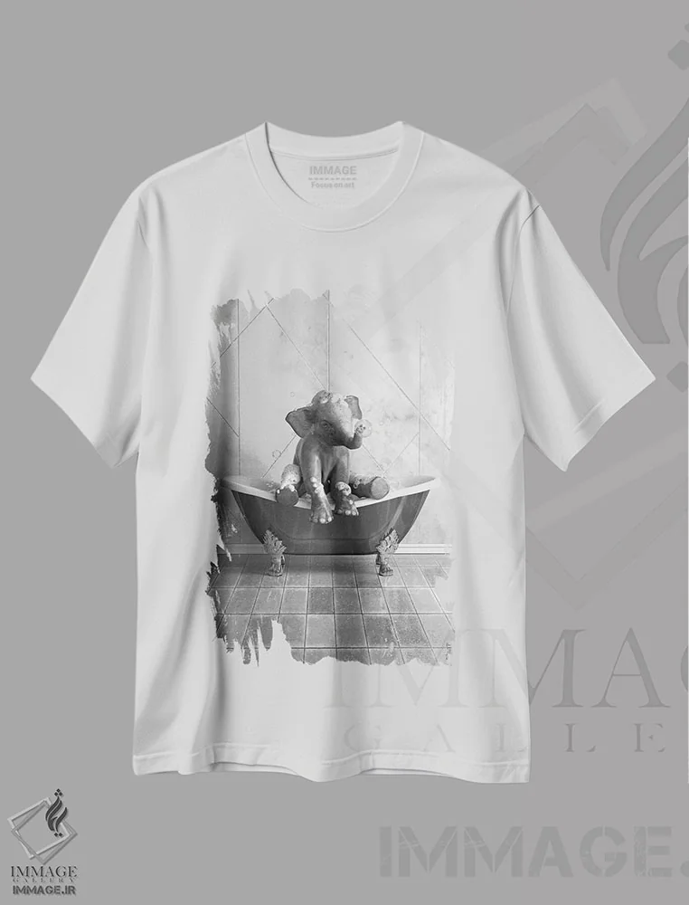 تیشرت سفید طرح دار طرح فیل برای حمام، هنر دیجیتال اثر جوفری فیلیپ | فروشگاه ایماژ تیشرت طرح دار طرح فیل برای حمام اثر جوفری فیلیپ