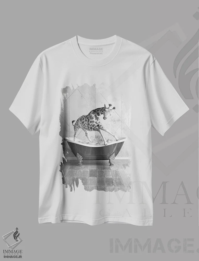 تیشرت سفید طرح دار زرافه در وان، هنر دیجیتال اثر جوفری فیلیپ | فروشگاه ایماژ تیشرت طرح دار زرافه در وان اثر جوفری فیلیپ