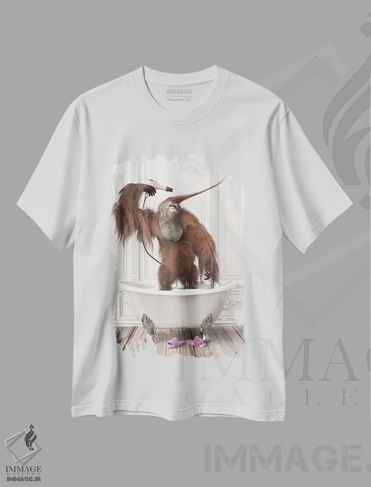 تیشرت سفید طرح دار اورانگوتان ها در حمام، هنر دیجیتال اثر جوفری فیلیپ | فروشگاه ایماژ تیشرت طرح دار اورانگوتان ها در حمام اثر جوفری فیلیپ