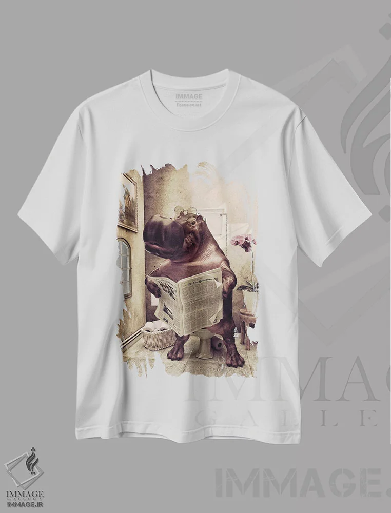 تیشرت سفید طرح دار آثار جوفری فیلیپ - immage.ir تیشرت طرح دار اسب آبی روی توالت، طرح بامزه حمام، هنر حیوانات سافاری اثر جوفری فیلیپ