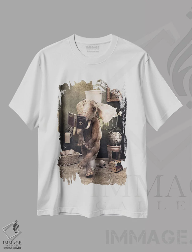 تیشرت سفید طرح دار آثار جوفری فیلیپ - immage.ir تیشرت طرح دار فیل نشسته روی توالت، طرح بامزه حمام، هنر حیوانات اثر جوفری فیلیپ