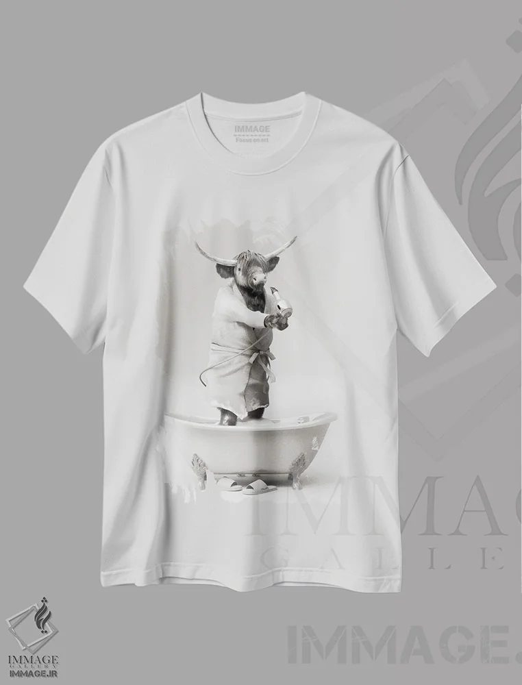 تیشرت مشکی طرح دار گاو کوهستانی در حمام، هنر دیجیتال اثر جوفری فیلیپ | فروشگاه ایماژ تیشرت طرح دار گاو کوهستانی در حمام اثر جوفری فیلیپ