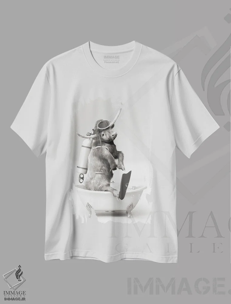 تیشرت سفید طرح دار آثار جوفری فیلیپ - immage.ir تیشرت طرح دار گاو کوهستانی در حمام در حال غواصی زیر آب اثر جوفری فیلیپ