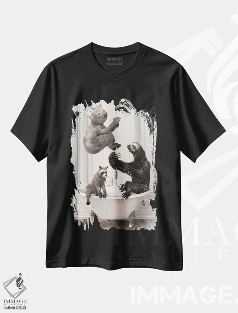 تیشرت مشکی طرح دار تنبل و کوالا در حمام، هنر دیجیتال اثر جوفری فیلیپ | فروشگاه ایماژ تیشرت طرح دار تنبل و کوالا در حمام اثر جوفری فیلیپ