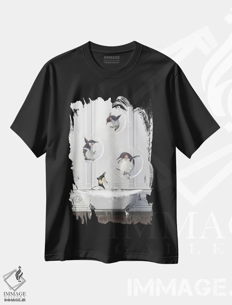 تیشرت مشکی طرح دار پنگوئن در حمام پر از حباب، هنر دیجیتال اثر جوفری فیلیپ | فروشگاه ایماژ تیشرت طرح دار پنگوئن در حمام پر از حباب اثر جوفری فیلیپ