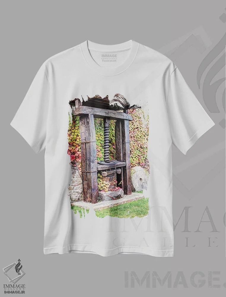 تیشرت سفید طرح دار آثار جولی اگِرز - immage.ir تیشرت طرح دار Castello Banfi, Siena Province, Tuscany Region, Italy,پرس قدیمی روغن زیتون، کاستلو بانفی، استان سینا، منطقه توسکانی، ایتالیا اثر جولی اگِرز