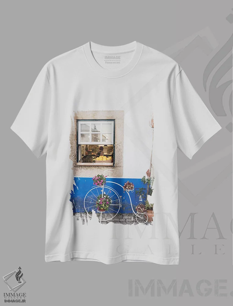 تیشرت سفید طرح دار آثار جولی اگِرز - immage.ir تیشرت طرح دار Obidos, Portugal,گلدان دوچرخه ای بامزه مقابل یک نانوایی در شهر دیوارکشی شده اوبیدوش، پرتغال اثر جولی اگِرز
